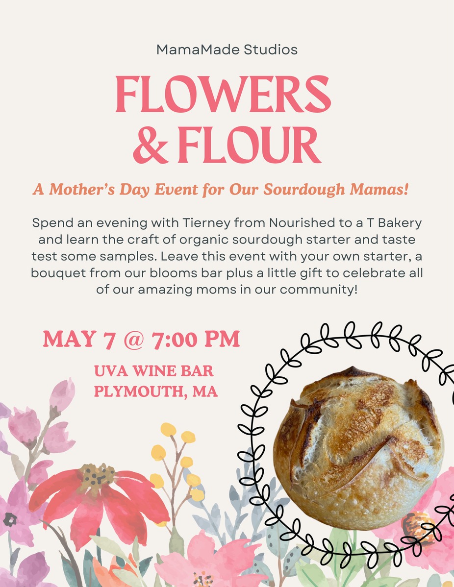 Spend an evening with Tierney from Nourished to a T Bakery and learn the craft of organic sourdough starter and taste test some samples. Leave this event with your own starter, a bouquet from our blooms bar, plus a little gift to celebrate all of our amazing moms in our community!